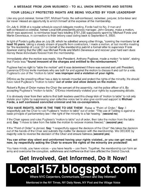 On July 9, 2008 at a regular schedule council delegate meeting, Forde had his No. 2 man and self-confessed co-criminal, John Greany, make a motion to reimburse legal fees totaling $751,235 supposedly spent by Michael Forde and Martin Devereaux, in connection to their September 6, 2000 bribery case.