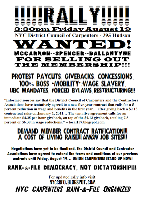 New York, August 23, 2011 – An organization of union members have announced a protest of United Brotherhood of Carpenters officials, Thursday, August 25th 3:30, at 395 Hudson, headquarters of the NYC District Council of Carpenters—the largest trade union in the city-- known for its history of leadership tied to organized crime, and decades of government supervision.